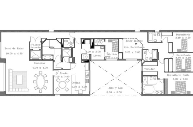 El edificio se desarrolla en 15 pisos, Planta Baja, y un subsuelo. Cada unidad consta de 4 dormitorios, 2 de ellos en suite, living-comedor, cocina con comedor diario, toilette, y dependencias de servicio, además de dos cocheras y una baulera.