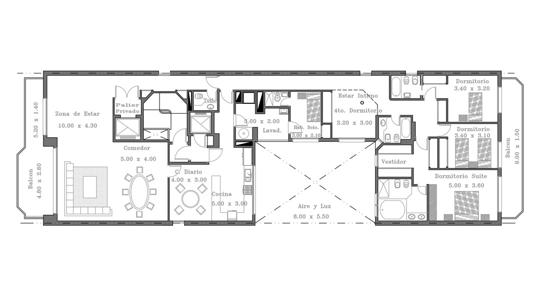 El edificio se desarrolla en 15 pisos, Planta Baja, y un subsuelo. Cada unidad consta de 4 dormitorios, 2 de ellos en suite, living-comedor, cocina con comedor diario, toilette, y dependencias de servicio, además de dos cocheras y una baulera.