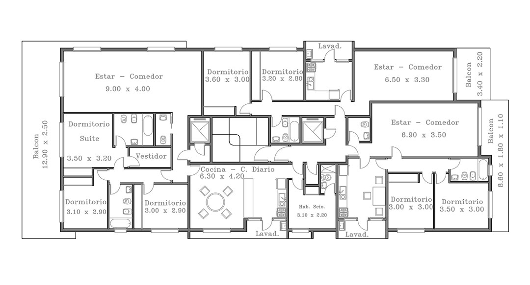 El resto de las plantas se desarrollan en torre, proyectándose 3 departamentos por nivel hasta el piso 8o, mientras que en los 2 últimos niveles se ubican 3 unidades en dúplex, la portería, y el tanque de reserva.