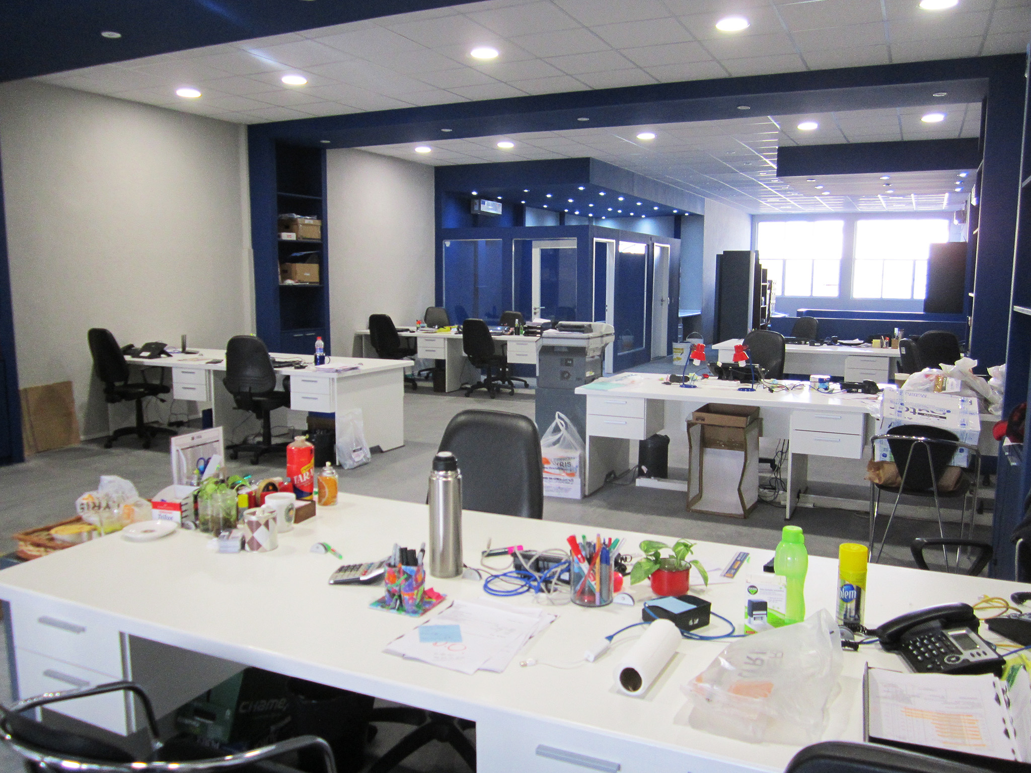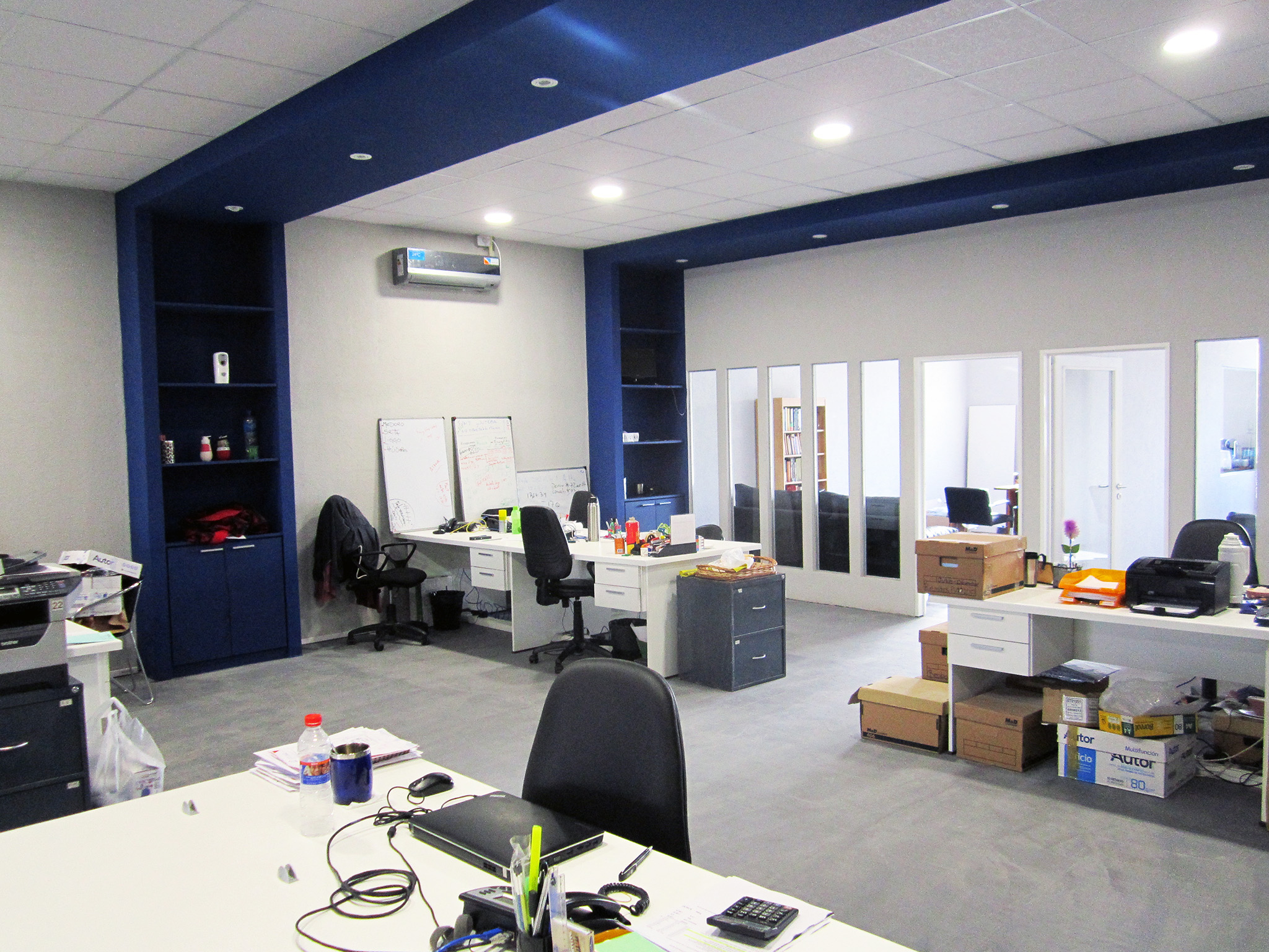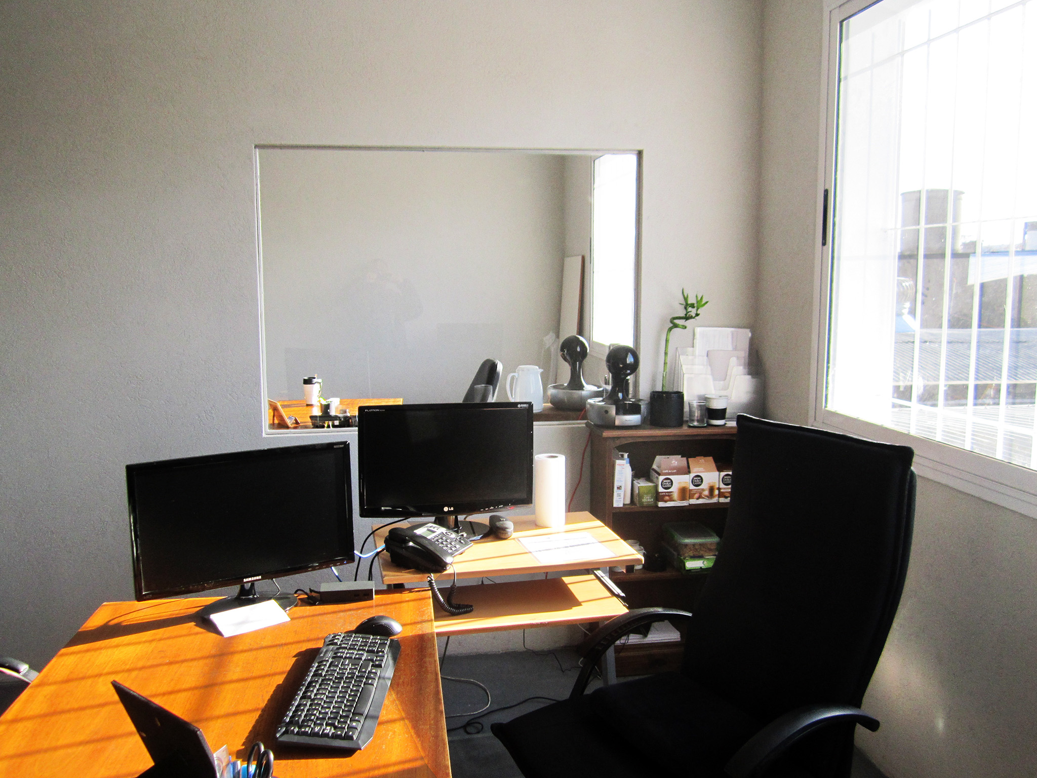 Así se formuló una especie de planta libre, donde el personal puede interactuar libremente según las necesidades eventuales. Se dispusieron los escritorios a ambos lados del espacio principal, y se ubicó la documentación (que no es mucha) en una especie de columnas que le dan ritmo al espacio.