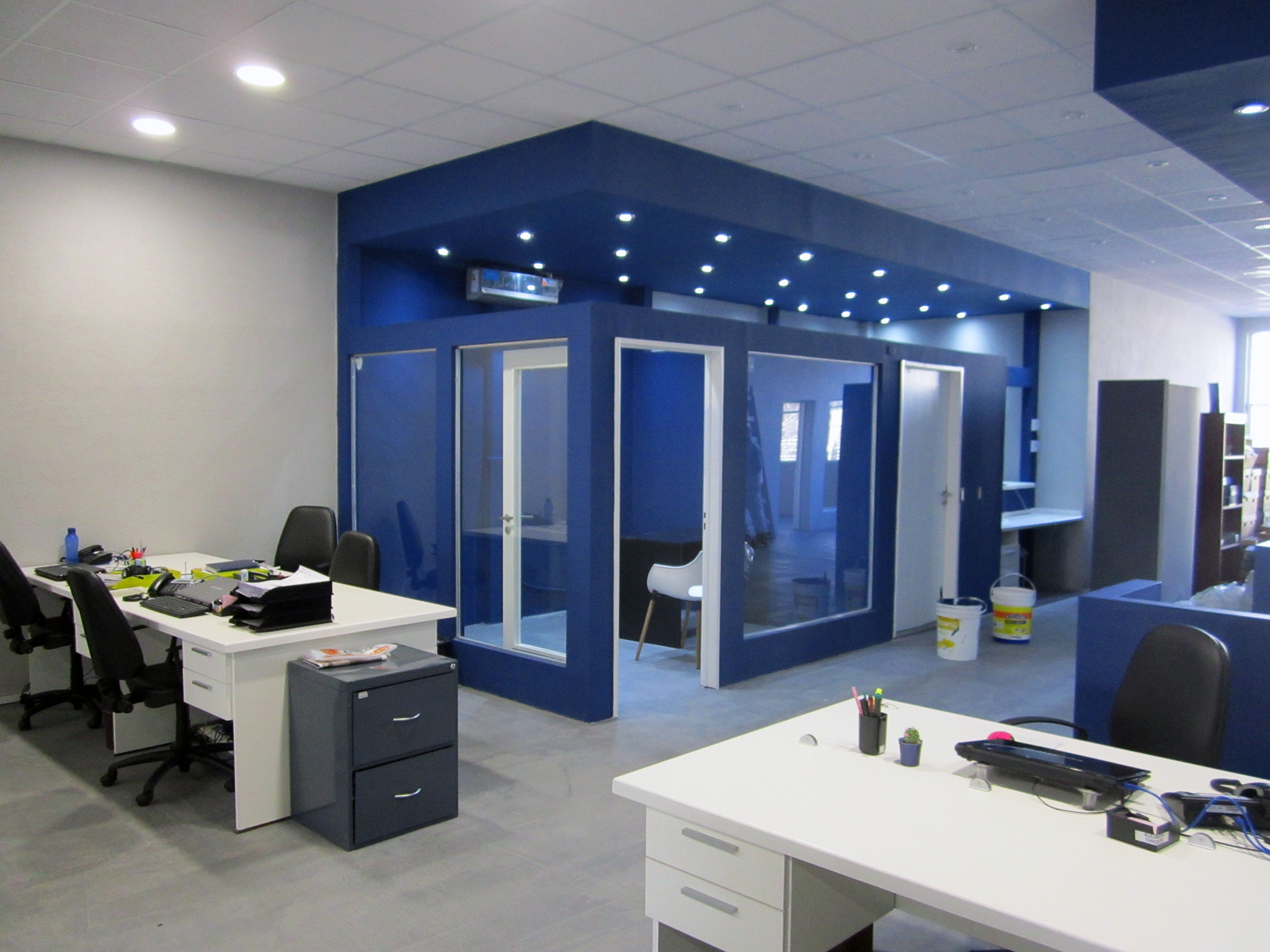 A partir de un depósito con techo parabólico de chapa en el primer piso, se proyectaron las oficinas comerciales, con 2 despachos principales, 2 salas de reunión, un área mas informal para algunas reuniones casuales, y las áreas de servicio para apoyatura de la función principal.