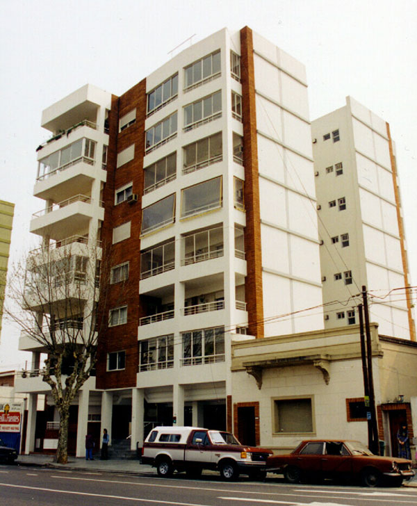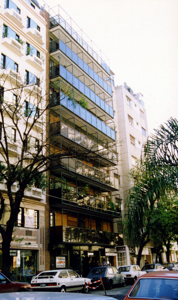 El edificio consta de PB, un subsuelo, y 7 pisos. En cada nivel se desarrollaron 4 unidades de vivienda, 2 de dos ambientes y 2 de tres. Los deptos. de 3 ambientes tienen cocina con c. diario, lavadero, baño y toilette, living, 2 dormitorios amplios, y un vestidor. Los deptos. de 2 ambientes tienen cocina-c.diario, lavadero, baño, un dormitorio, y living. La planta tipo se desarrolló con 2 patios de aire y luz, y ubicando centralmente el núcleo de circulación vertical,