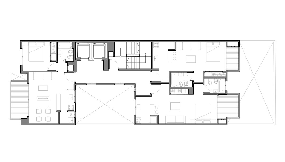 El proyecto se desarrolla en planta baja y 10 pisos. En la planta baja se han localizado 6 cocheras y algunos servicios centrales. En la planta tipo se ubicaron 2 monoambientes al contrafrente, y un 2 ambientes al frente con un amplio balcón y cocina integrada.